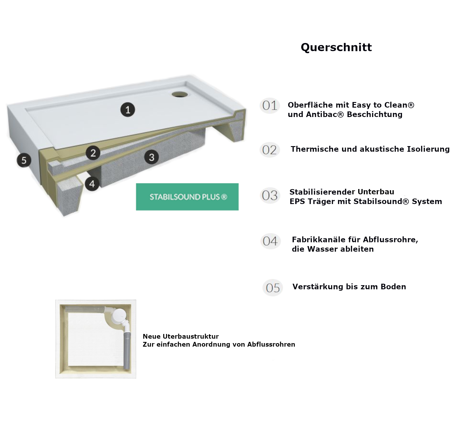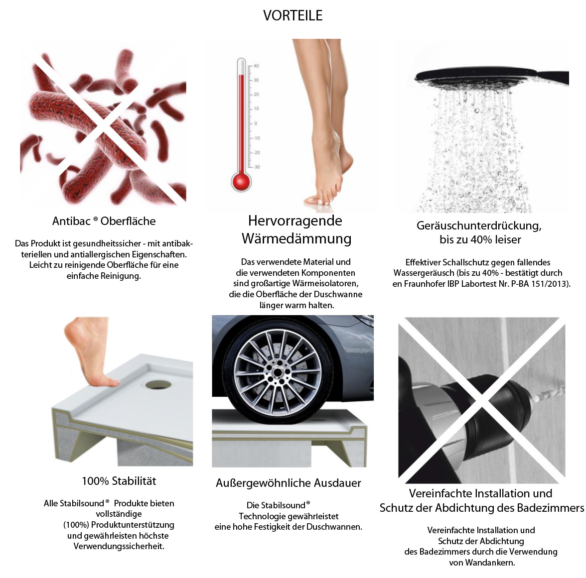 - Duschwannen Stabilsound® haben eine integrierte Form bestehend aus einer stabilen Acrylplatte und einem EPS-Träger (System Stabilsound® PU+), Druckfestigkeit bis 750 kg. Flächen vollständiger Unterbau sowohl unter der Trittfläche als auch unter den Duschwannenrändern. Sicher und freundlich für Gesundheit und Umwelt (FCKW-frei).