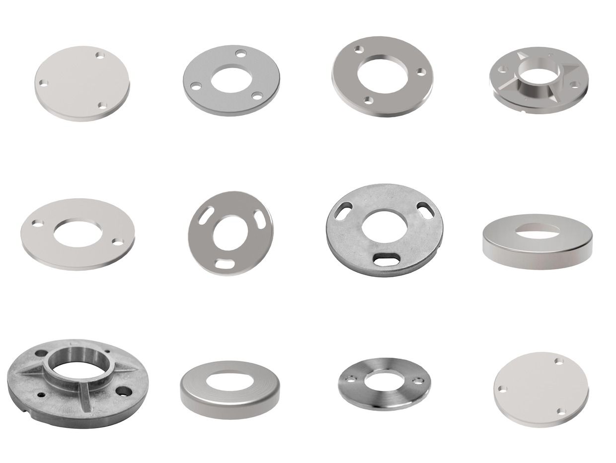 Hochwertiges Sortiment an Ankerplatten, Bodenflansche, Ronden und Abdeckrosetten für den professionellen Geländerbau. Alle Komponenten bestehen aus rostfreiem Edelstahl AISI 304 (V2A.