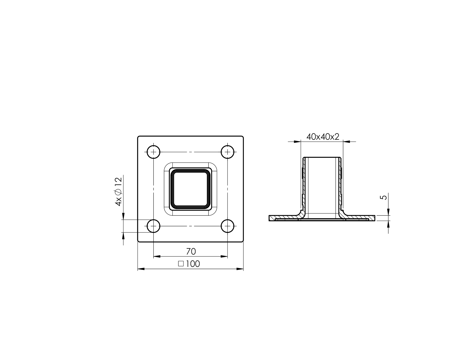Für Edelstahl-Vierkant-Geländerpfosten, kann in das Absperrprofil eingeklebt werden. Außenmaße: 105x105/ Pflanzstutzen H=35mm für 40x40x2 mm Absperrprofil, 4x Befestigungslöcher d12mm, mit Metallkleber auf den Pfosten geklebt, Materialqualität AISI 304, Oberfläche poliert.