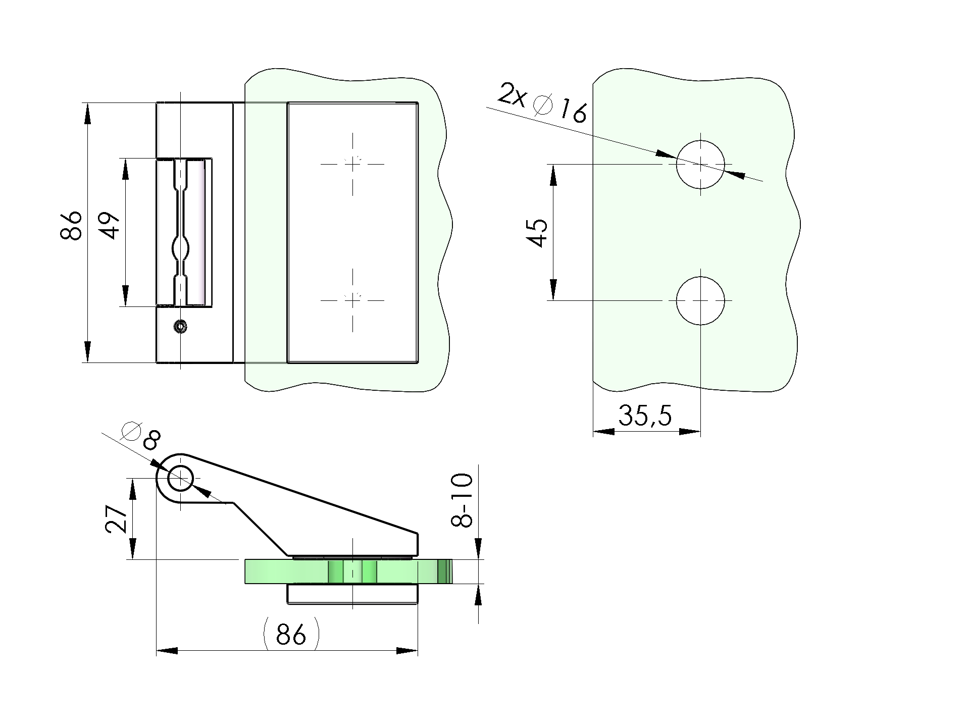 Material: Edelstahl AISI 304, Oberflächengüte: Schliff, Glass t: 8-10, Gmax(kg)/2pcs: 50, Loch im Glas: Ja