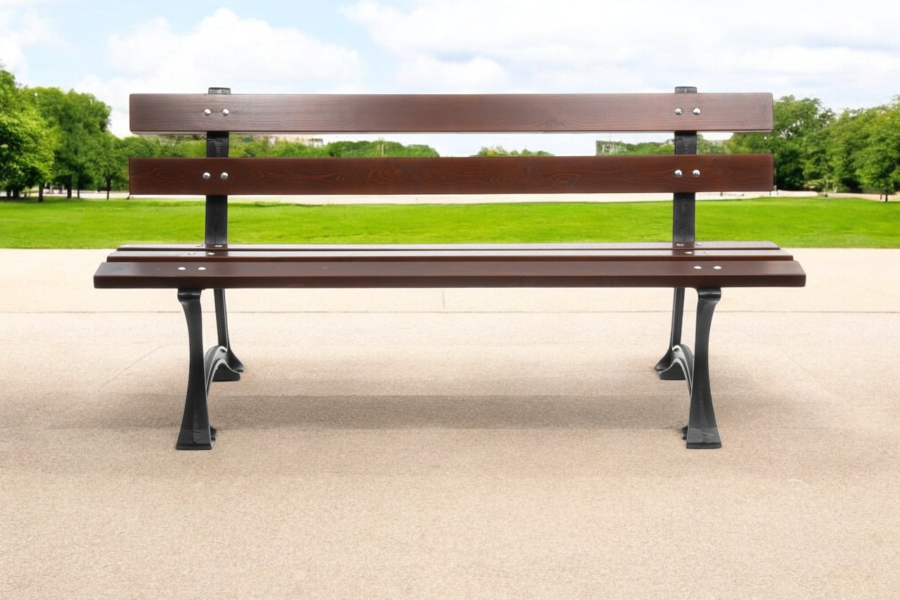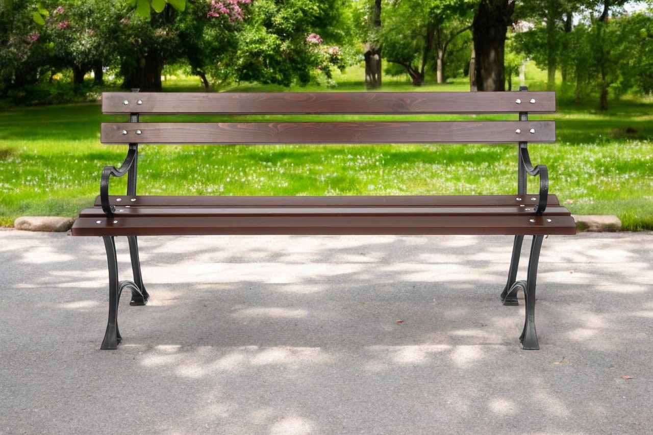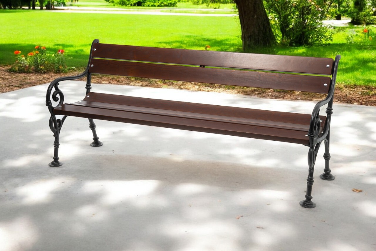 Elegante Parkbank mit robustem Gusseisen-Gestell und Fichtenholz-Elementen für Garten und Park. Die wetterfeste Konstruktion vereint traditionelles Design mit langlebigen Materialien.