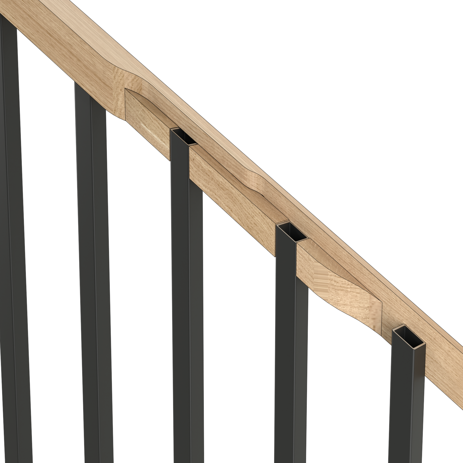 Abb. 2 Querschnitt, der die Montageart des Handlaufs an den Balustraden eines geneigten Treppengeländers zeigt (Balustraden im oberen Bereich schräg angeschnitten).