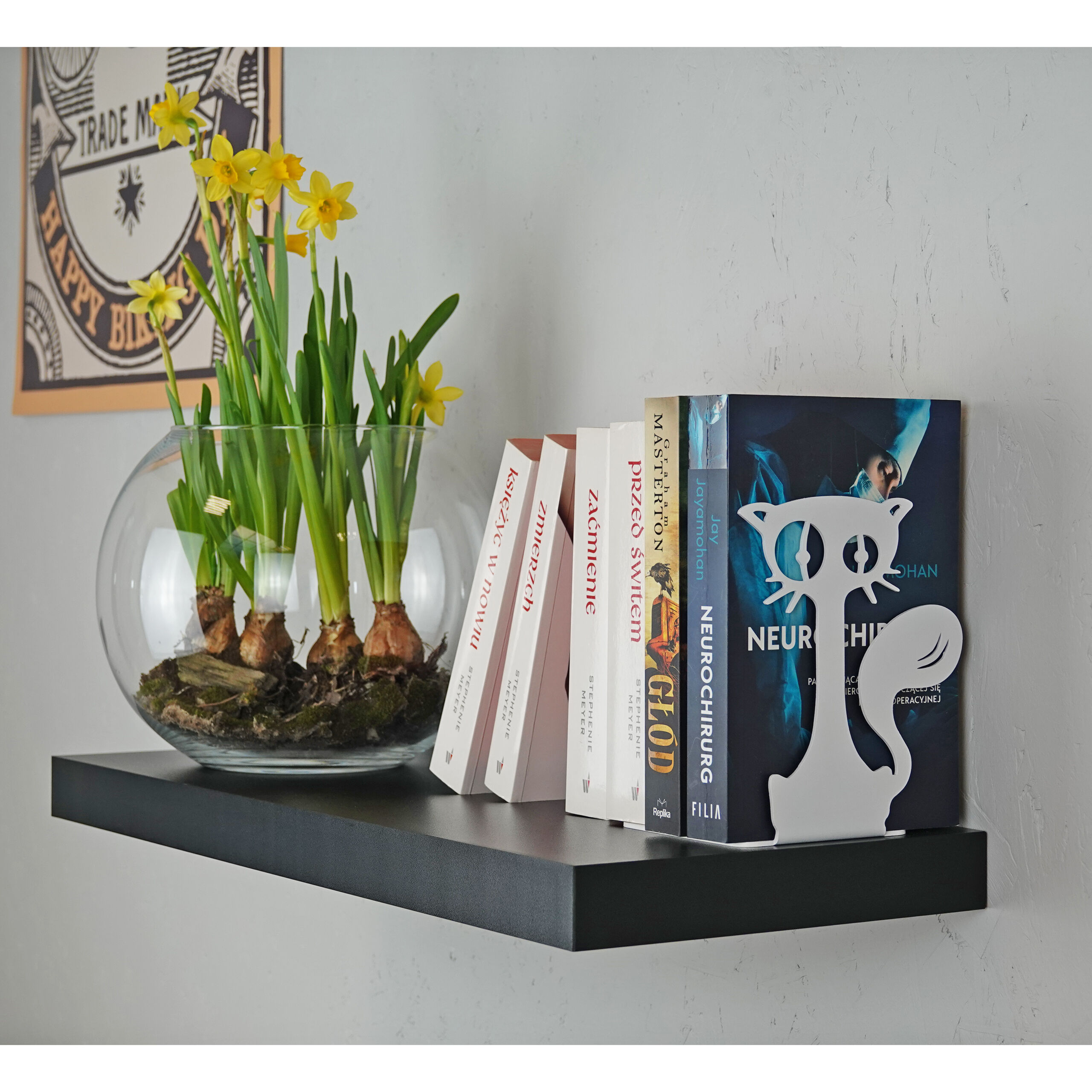 Für Besitzer der Buchstütze KATZE 3 wird das Ordnen von Büchern nie wieder ein Problem sein. Dieses kleine Gadget schützt Ihre Sammlung nicht nur, sondern präsentiert sie auch ordentlich. Es kann problemlos auf einem Regal ohne Seitenwände stehen. Es hält die Bücher aufrecht und bringt eine humorvolle Note in den Raum. Geeignet für Jugend- und Studentenzimmer. Die Buchstütze KATZE 3 besteht aus 2 mm dickem Stahl. Dadurch hält es Bücher gut und verbiegt sich nicht. Laserschneiden und Pulverbeschichtung sorgten für eine hohe Detailgenauigkeit und satte Farben. Der Support wird in einem ordnungsgemäß gesicherten Paket verschickt.