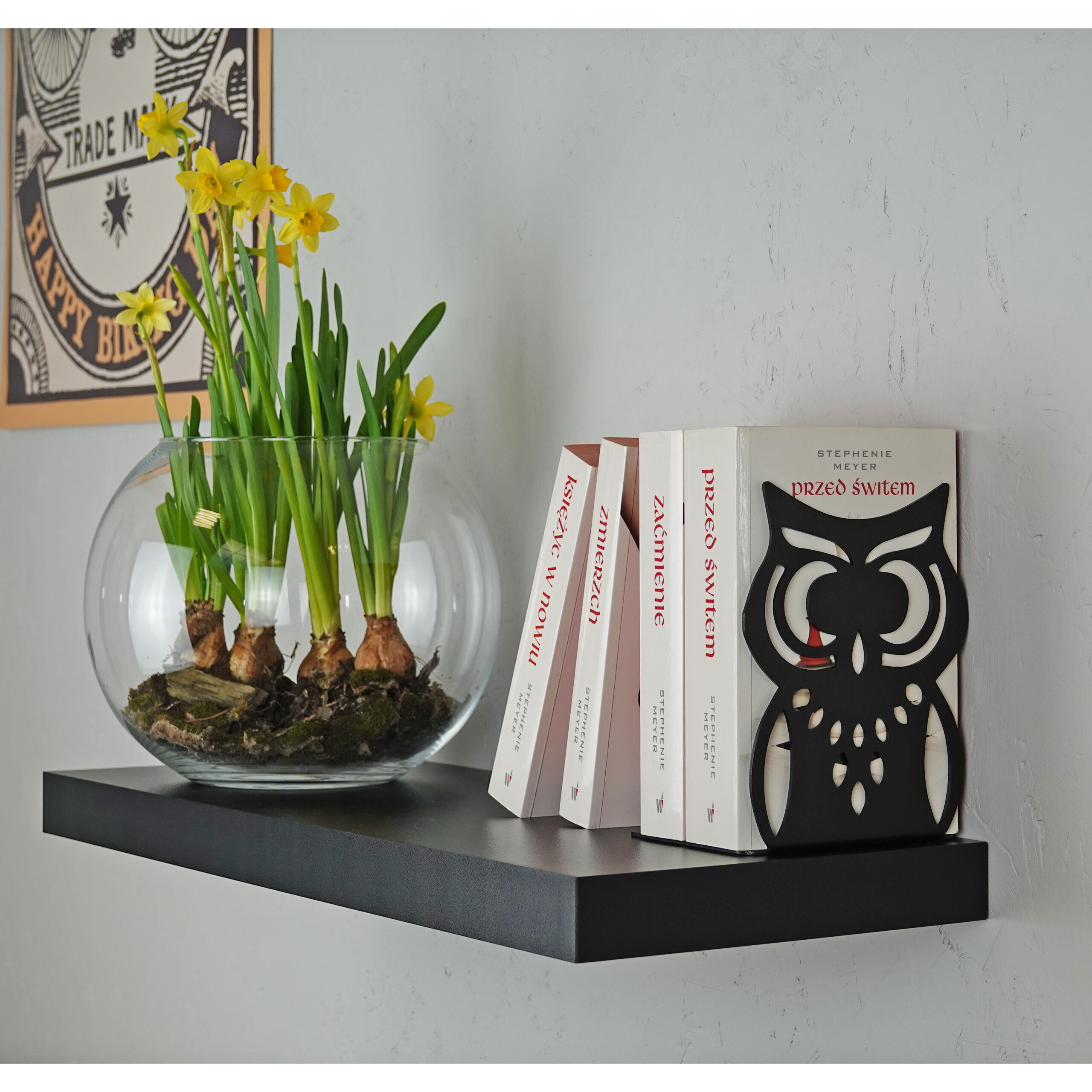 Die Buchstütze OWL 2 in Schwarz ist ein einzigartiges Geschenk für jeden Buchliebhaber. Die Eule symbolisiert Weisheit, und das Motiv dieses Tieres ist sehr stark mit der Welt der Bibliotheken und der allgemein verstandenen Lektüre verbunden. Mit diesem praktischen Gadget können Sie Ihre Bücher organisieren. Es wird den Räumen einen einzigartigen Charakter verleihen und literarische Interessen hervorheben. Die Buchstütze OWL 2 besteht aus 2 mm dickem Stahl, was sie langlebig macht und mehrere Bücher in verschiedenen Größen trägt. Durch die Pulverbeschichtung erhielt es eine satte Farbe, die vor dem Hintergrund des Covers wunderschön zur Geltung kam.