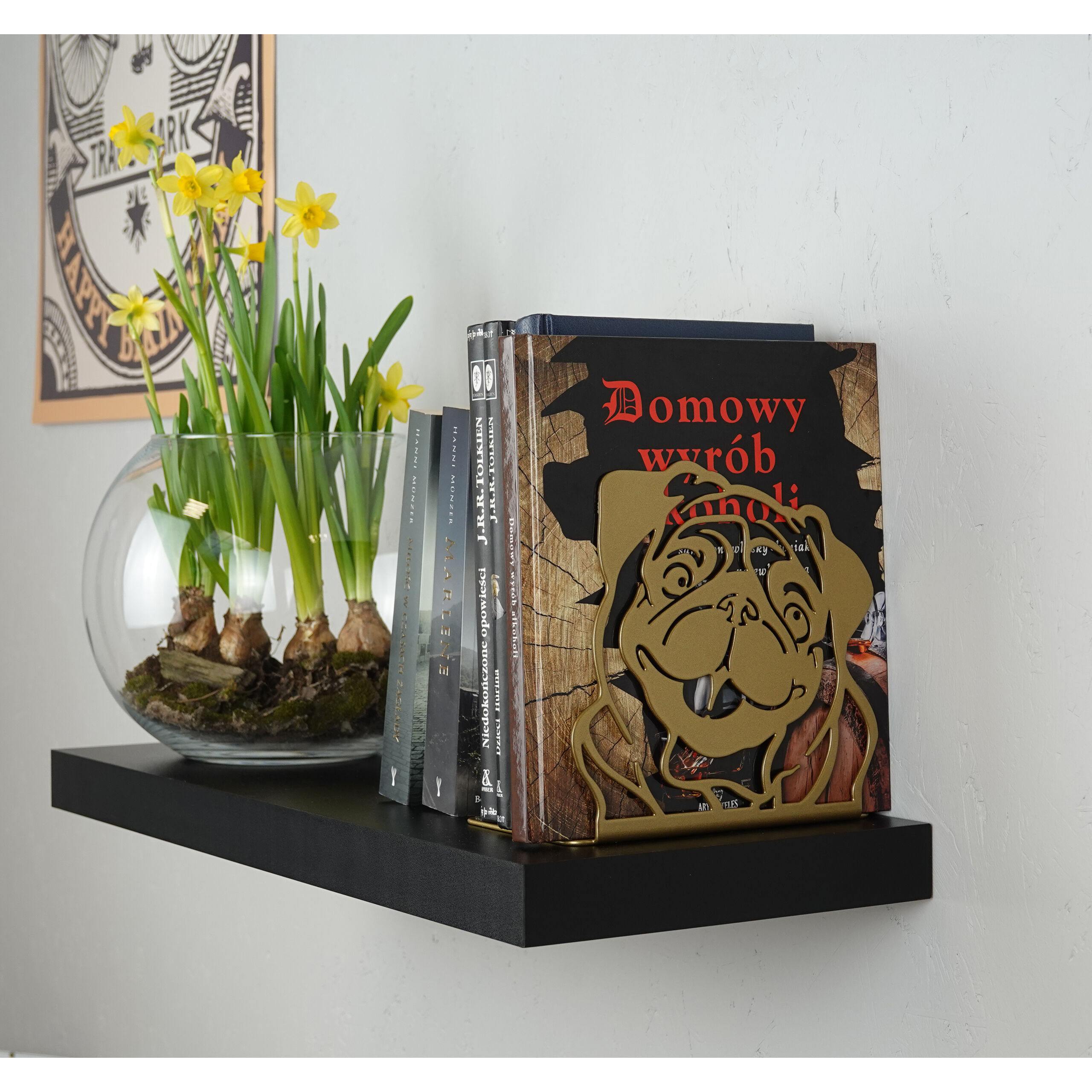 Die Buchstütze DOG in Gold wurde zur Dekoration von Wohnzimmern, Bücherregalen und Jugendzimmern geschaffen. Es eignet sich besonders für faszinierende, in dunklen Farben dekorierte Räume, klassische Räume und eklektische Innenräume. Dieser einzigartige Hund kümmert sich, wie es sich für einen treuen Begleiter gehört, um Bücher und verhindert unschönes Chaos im Regal. Aufgrund seiner Abmessungen ist er auch für größere Kopien geeignet. Die DOG-Buchstütze wurde aus Stahl gefertigt, die Pulverbeschichtung schützte die Unterlage vor Beschädigungen. Dieses Buch-Gadget eignet sich als Geschenk für alle, die sich um ihre Lesesammlung kümmern möchten.