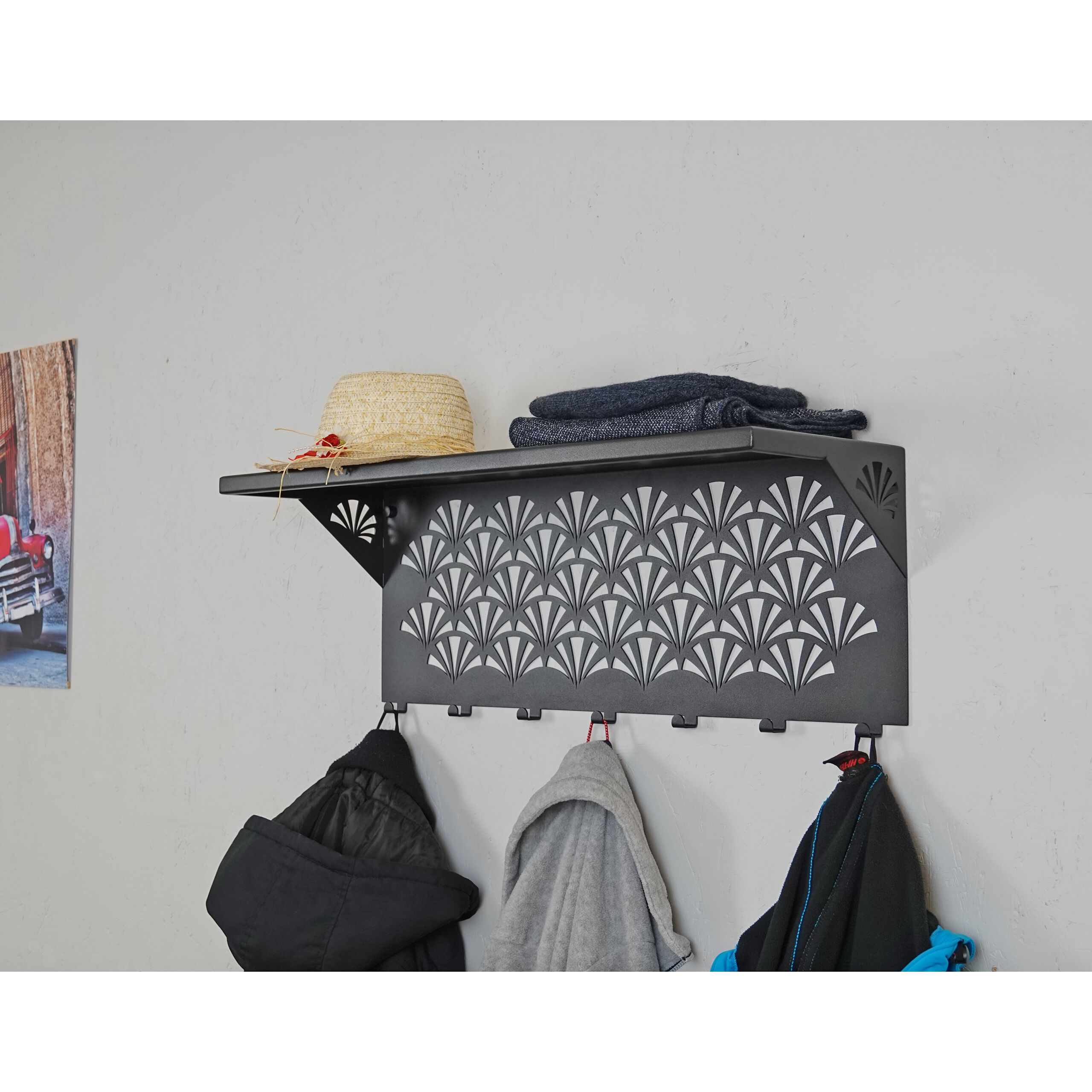 Startseite » Möbel & Wohnen » Deko & Accessoires » Wandaufhänger und Griffe » Kleiderbügel mit Ablage » Kleiderhaken Garderobenleiste Hakenleiste Schwarz mit Ablage - 70 cm - aus Metall, für Eingang, Flur, Schlafzimmer, Flurgarderobe mit 7 Haken / W-2