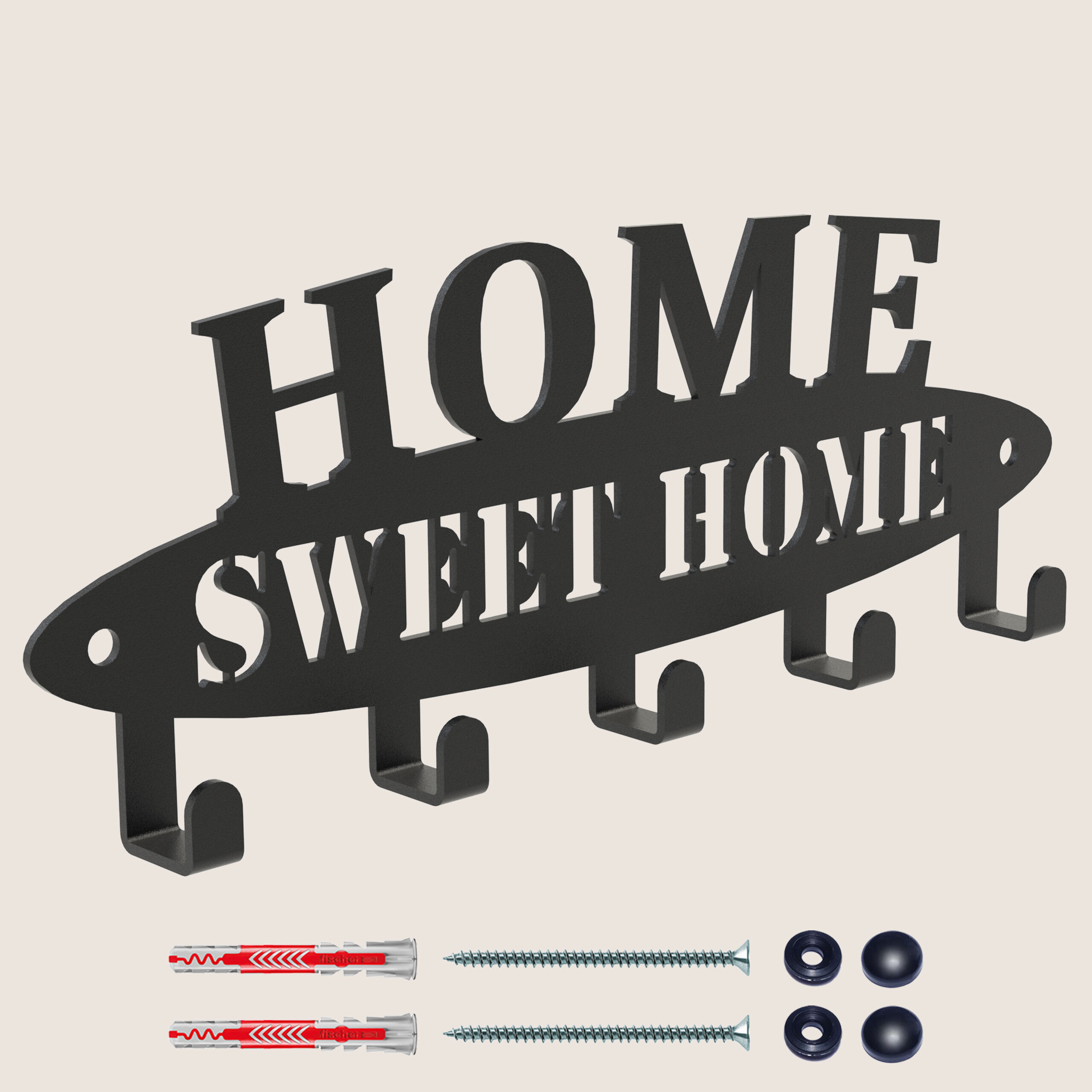 Der HOME-Schlüsselanhänger besteht aus 2 mm dickem Stahl. Die Aufschrift wurde mit einem Laser geschnitten, wodurch jedes Detail präzise wiedergegeben wird, und die ausdrucksstarken Buchstaben bilden einen Kontrast zur Oberfläche, auf der diese interessante Ergänzung angebracht wird. Der Kleiderbügel ist ein Produkt zur Selbstmontage, daher liegt der Bestellung ein Satz Befestigungsstifte und Schrauben bei.