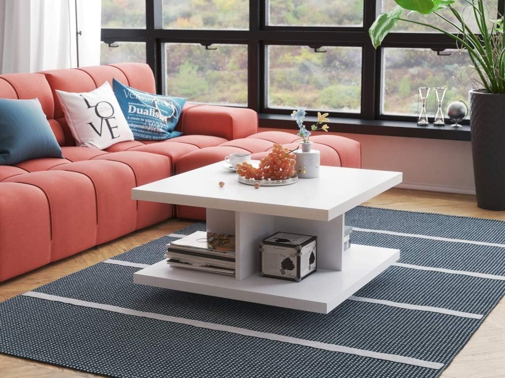Nichts erhellt und erfrischt den Wohnbereich so sehr wie weiße Möbel! Wenn Sie mehr Weiß in Ihrem Wohnzimmer haben möchten, dann wird Sie der Grafi Couchtisch mit quadratischer Platte sicher interessieren. Der Sofatisch Grafi besticht durch seine innovative Form, die zudem gutes Aussehen mit unglaublicher Funktionalität verbindet. Dieser Beistelltisch ist ein idealer Begleiter für Ihr Sofa oder Ihren Sessel, mit dem er eine gemütliche Kaffee-Ecke bildet, ideal zum Ausruhen und Entspannen bei einer Tasse Kaffee oder Tee. Der quadratische Couchtisch Grafi für das Wohnzimmer ist ganz aus beidseitig beschichteter Platte gefertigt - in Mattweiß. Die Basis des Tisches ist mit Filzgleiter ausgestattet, um den Boden vor Beschädigungen zu schützen.