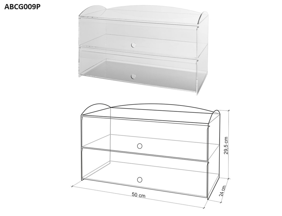 Ein hochfunktionelles Acryl-Glas-Vitrinenmodell mit Fächern für Kuchen, Hefe und Süßigkeiten.