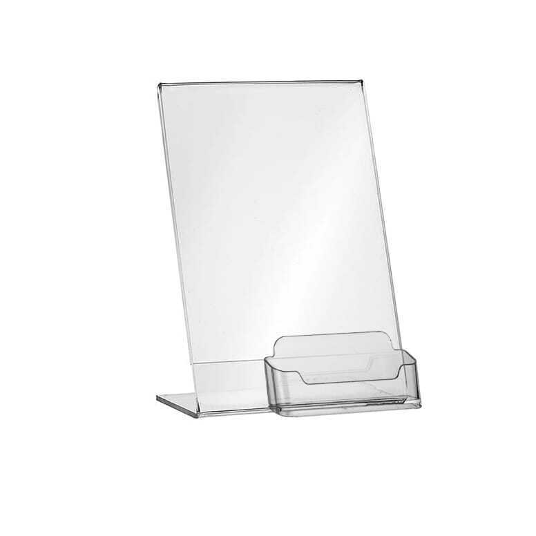 Startseite » Werbeaufsteller » L-Ständer » L Ständer mit Fach Visitenkartenhalter Flyer A4 Prospektständer Acryl-Glas