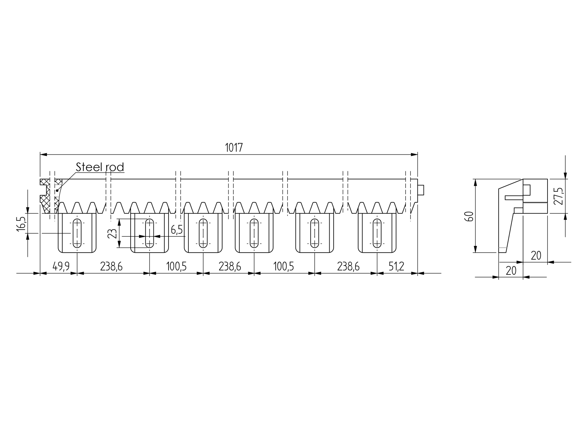 Gezahnter Nylonkamm mit Stahlkern für Schiebetore, mit sechs nach unten gerichteten Griffen. Wird ohne Schrauben und Unterlegscheiben geliefert.