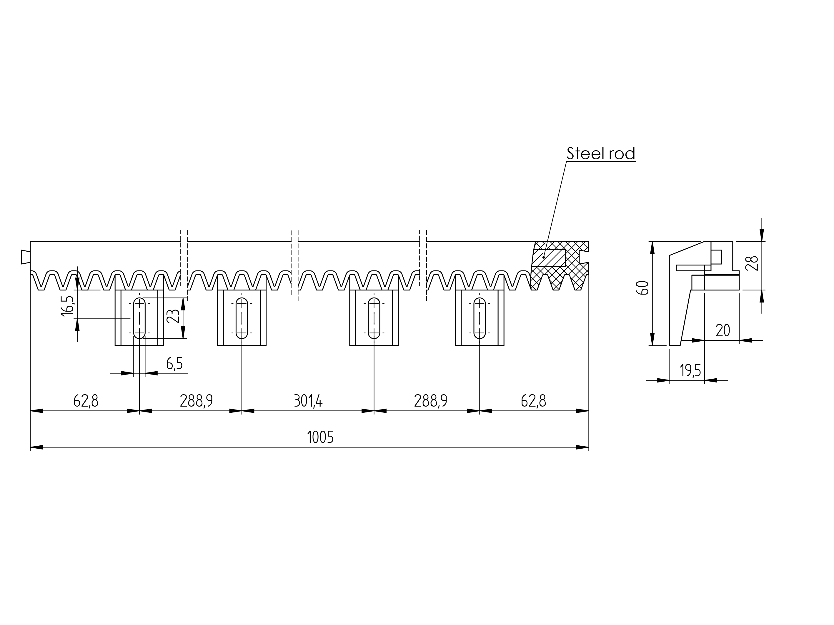 Kunststoffzahnstage mit Stahlkern, PVC+Fe,light, L 1+1m